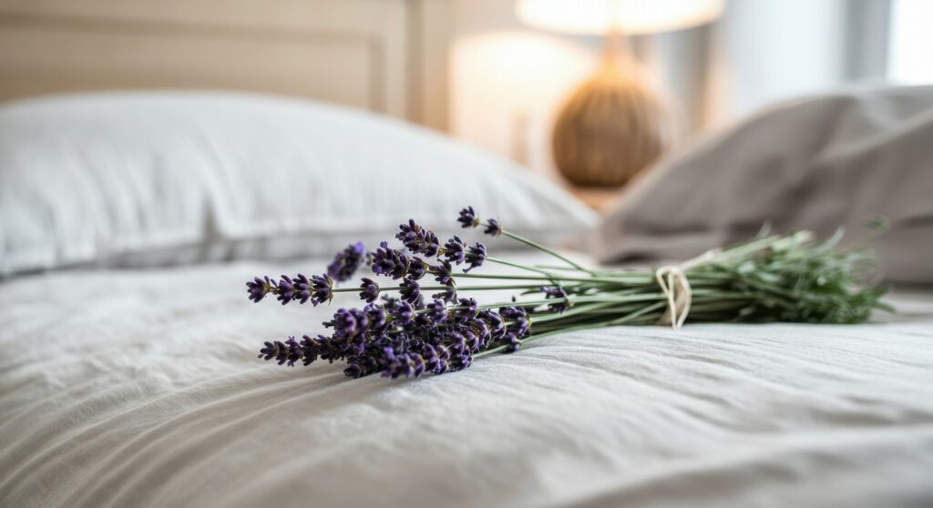 La lavanda es el aroma por excelencia del descanso. Su fragancia floral y fresca ayuda a reducir la frecuencia cardíaca y la tensión muscular, preparando al cuerpo para dormir.