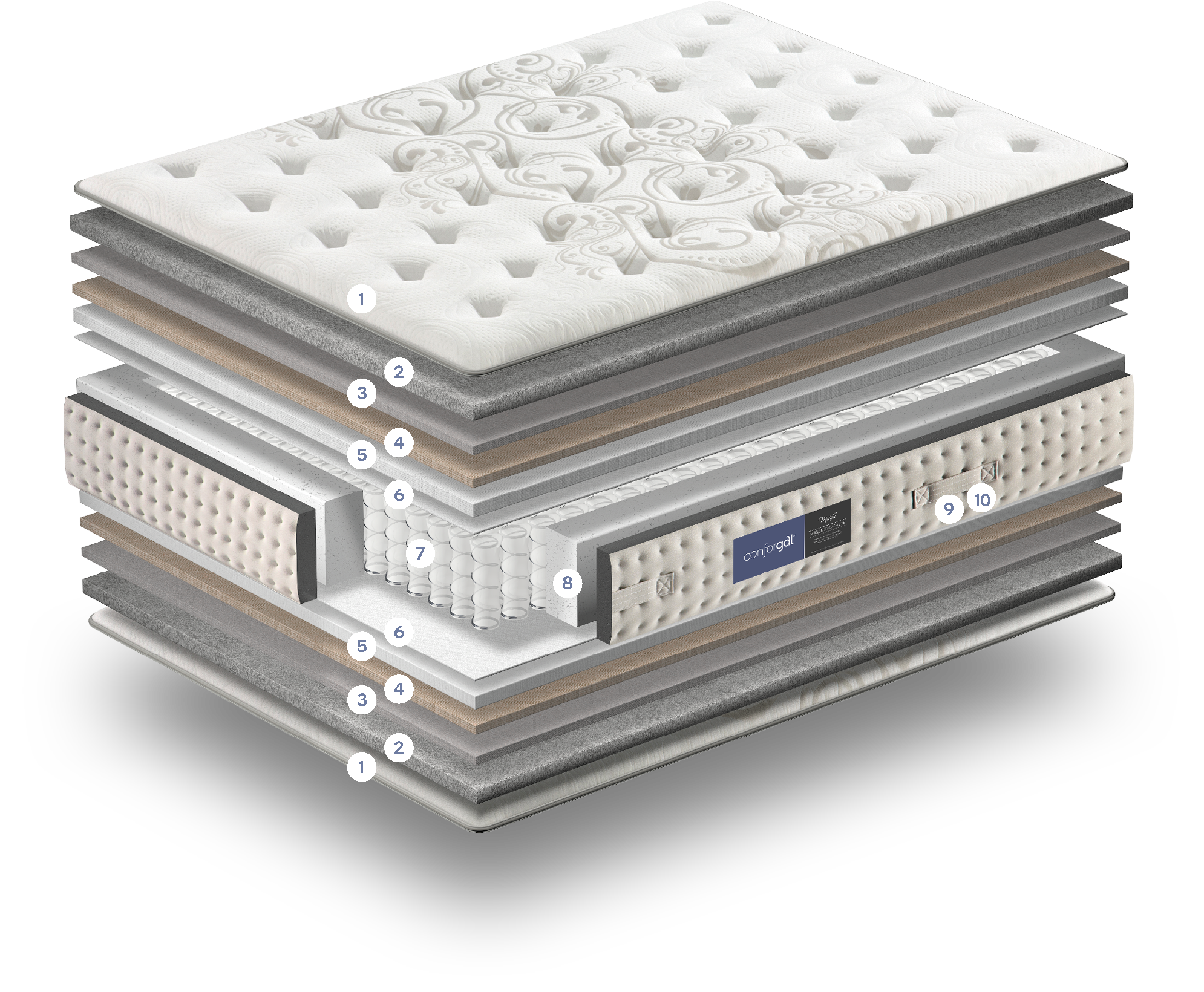 Conforsuit. Material que ofrece confort, elasticidad y resistencia inigualable. Resultado de un proceso ecológico libre de CFC, con estructura celular abierta permitiendo circular el aire libremente por lo que el núcleo disfruta de una favorable oxigenación y temperatura.